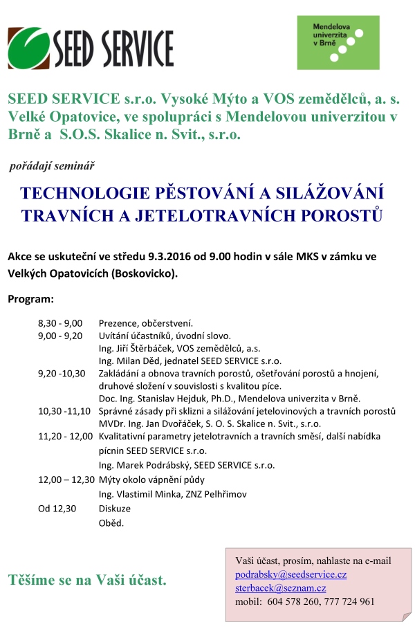 pořádá SEED SERVICE s.r.o. Vysoké Mýto a VOS zemědělců, a. s. Velké Opatovice, ve spolupráci s Mendelovou univerzitou v Brně a S.O.S. Skalice n. Svit., s.r.o. v sále MKS v zámku ve Velkých Opatovicích (Boskovicko).