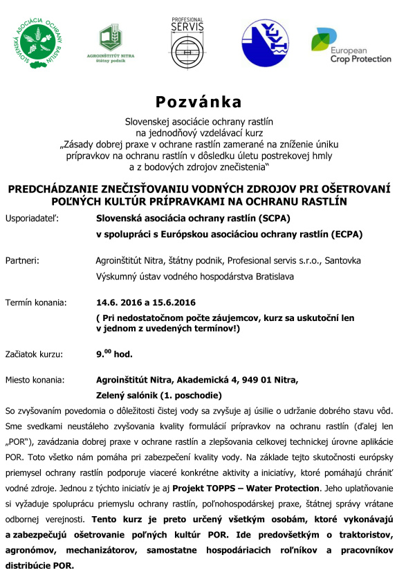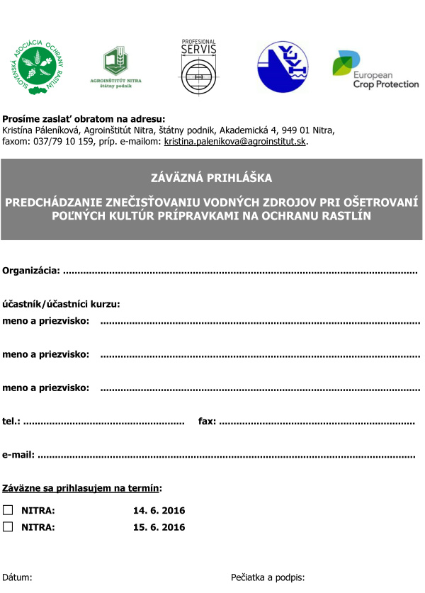 Predchádzanie znečisťovaniu vodných zdrojov pri ošetrovaní poľných kultúr prípravkami na ochranu rastlín, Nitra, 2016