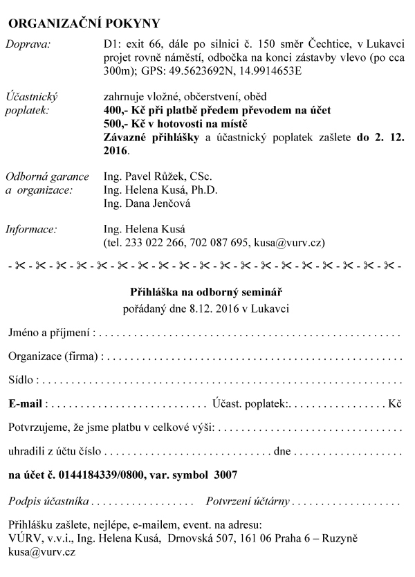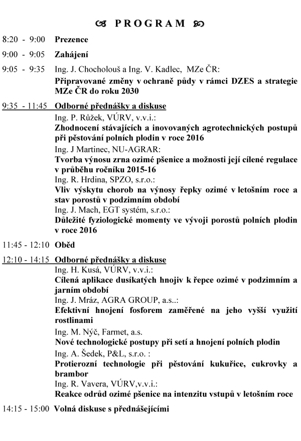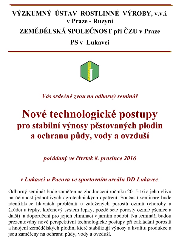 Nové technologické postupy pro stabilní výnosy pěstovaných plodin a ochranu půdy, vody a ovzduší pořádá VÝZKUMNÝ ÚSTAV ROSTLINNÉ VÝROBY, v.v.i. v Praze - Ruzyni, ZEMĚDĚLSKÁ SPOLEČNOST při ČZU v Praze a PS v Lukavci