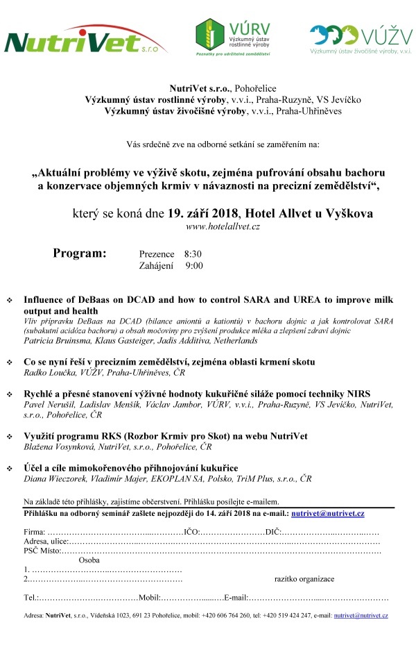 Aktuální problémy ve výživě skotu, zejména pufrování obsahu bachoru a konzervace objemných krmiv v návaznosti na precizní zemědělství v Hotelu Allvet u Vyškova pořádá NutriVet s.r.o., VÚRV a VÚŽV