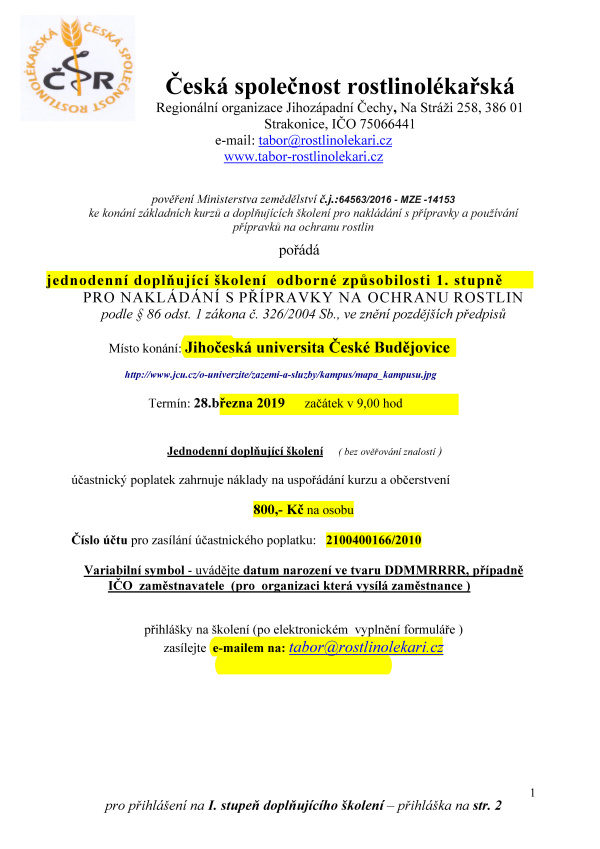 pořádá Česká společnost rostlinolékařská, pobočný spolek Jihozápadní Čechy