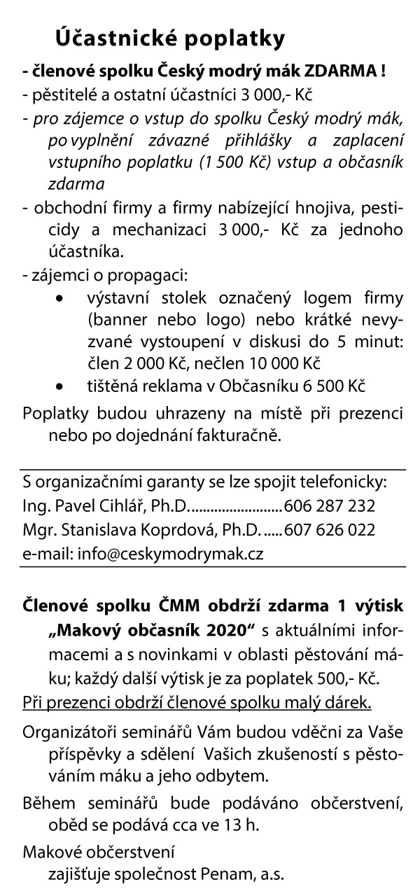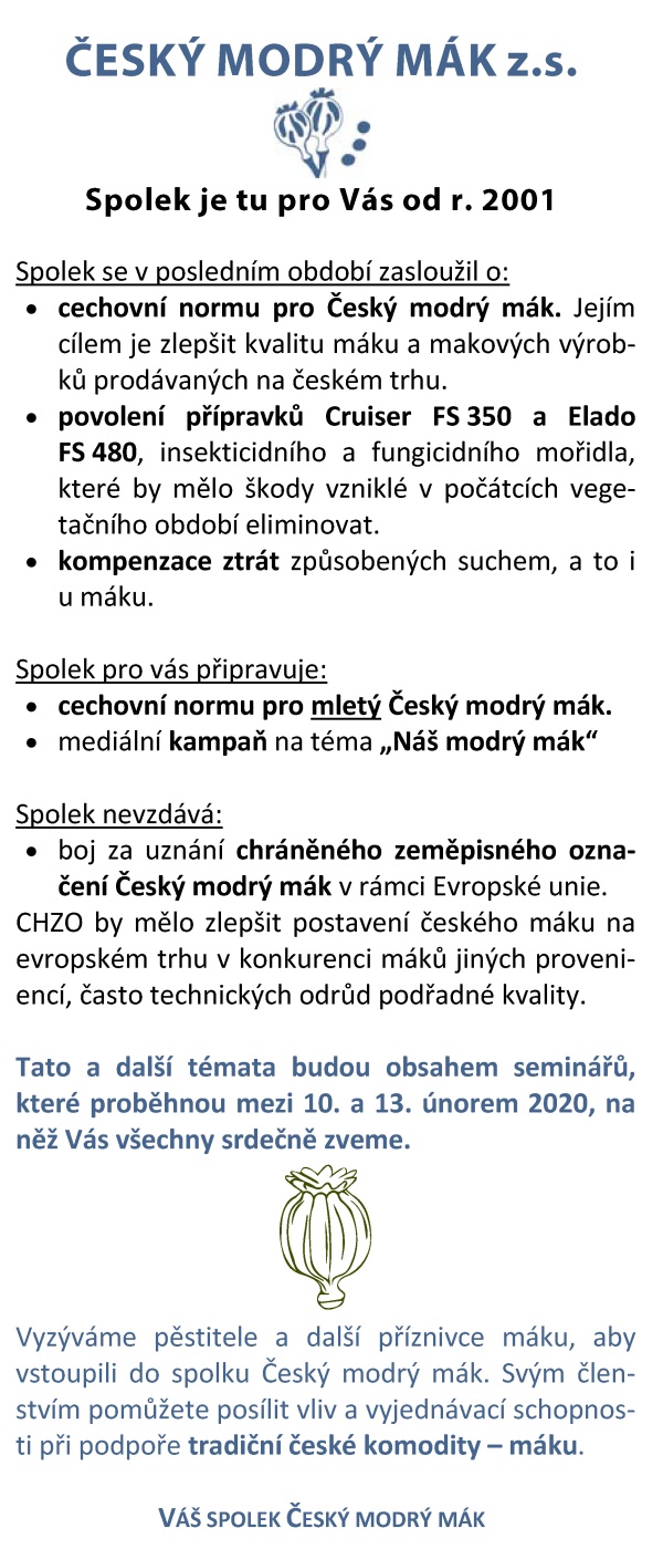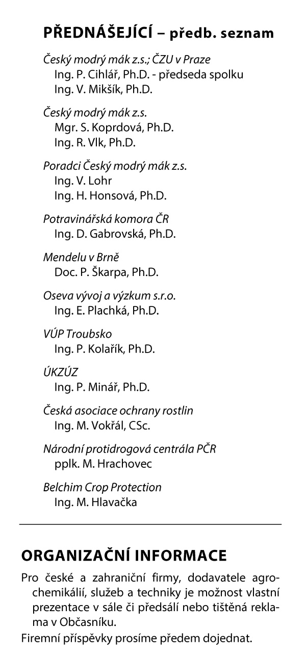 ČESKÝ MODRÝ MÁK z.s. ČESKÁ ZEMĚDĚLSKÁ UNIVERZITA V PRAZE pořádají 20. ročník ODBORNÝCH SEMINÁŘŮ MÁK V ROCE 2020 T É M A: Potenciální rizika pěstování máku konané dne 10. 2. 2020, Hospoda U Bohouše, Libčany, o. Hradec Králové dne 11. 2. 2020, Hostinec U Facků, Vsisko, o. Olomouc dne 12. 2. 2020, KD Větrný Jeníkov, o. Jihlava dne 13. 2. 2020, Rest. „Sokolovna“, Červený Újezd, o. Praha-západ PROGRAM a TÉMATA SEMINÁŘŮ 9.00 – 9.30....... Prezence účastníků a občerstvení 9.30 – 13.00 .... Odborný program /diskuse  Trh s mákem v roce 2019, očekávaná ekonomika pěstování a odbyt v roce 2020  Česká cechovní norma Český modrý mák  Rizikové látky na českých polích  Založení porostu máku, protierozní rozmístění a agrotechnika  Úprava osiva, moření  Aktuální situace s přípravky do máku  Výživa máku za sucha  Možnosti ochrany proti krytonosci kořenovému na jaře, noví škůdci  Nové choroby v měnícím se klimatu  Vyhodnocení pokusného roku 2019  Rizika pěstování máku v letech 2021 a dál  Činnost spolku 2019 a 2020  Diskuse 13.00 – 13.30.. Společný oběd PŘEDNÁŠEJÍCÍ – předb. seznam Český modrý mák z.s.; ČZU v Praze Ing. P. Cihlář, Ph.D. - předseda spolku Ing. V. Mikšík, Ph.D. Český modrý mák z.s. Mgr. S. Koprdová, Ph.D. Ing. R. Vlk, Ph.D. Poradci Český modrý mák z.s. Ing. V. Lohr Ing. H. Honsová, Ph.D. Potravinářská komora ČR Ing. D. Gabrovská, Ph.D. Mendelu v Brně Doc. P. Škarpa, Ph.D. Oseva vývoj a výzkum s.r.o. Ing. E. Plachká, Ph.D. VÚP Troubsko Ing. P. Kolařík, Ph.D. ÚKZÚZ Ing. P. Minář, Ph.D. Česká asociace ochrany rostlin Ing. M. Vokřál, CSc. Národní protidrogová centrála PČR pplk. M. Hrachovec Belchim Crop Protection Ing. M. Hlavačka ORGANIZAČNÍ INFORMACE Pro české a zahraniční firmy, dodavatele agrochemikálií, služeb a techniky je možnost vlastní prezentace v sále či předsálí nebo tištěná reklama v Občasníku. Firemní příspěvky prosíme předem dojednat.