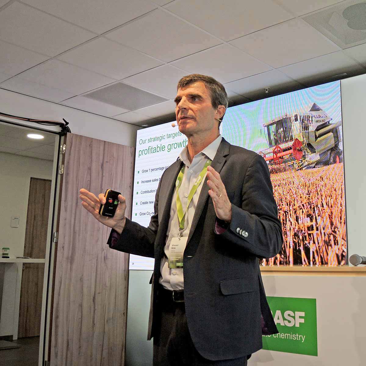 Během úvodního vystoupení představil Vincent Gros, ředitel zemědělské divize BASF, současnou situaci společnosti a především vnímání současného a budoucího trhu, kdy je třeba brát v úvahu jak potřeby zemědělců, tak i ostatních skupin obyvatel, pro pochopení, o jaké produkty bude zájem. Základem současné nabídky jsou přípravky na ochranu rostlin, mořidla, osiva a prostředky digitálního zemědělství, které dávají předpoklad dalšího růstu v celosvětovém měřítku. Do roku 2030 je tak očekáváno navýšení obratu zemědělské divize o 50 %. Tento předpoklad je podpořen více než 30 novými produkty, které by do roku 2028 měly přijít na trh a odhaduje se jejich potenciál navýšení obratu až o 6 mld. Euro. Tyto údaje odpovídají současnému trendu, kdy společnost roste o 5 % ročně. Rozvoji napomáhají i investice do výzkumu a vývoje, které v letošním roce činily přibližně 900 mil. Euro. Současná strategie firmy je otevřená novým výzvám a technologiím, které se mohou stát dalšími součástmi rozvoje společnosti, jak uvedl Vincent Gros. V následujících letech se tak chystá příchod 9 nových účinných látek, unikátních řešení a výkonných odrůd zeleniny, bavlny, sóji a také hybridní pšenice, jejíž uvedení se na našem trhu chystá ve střednědobém horizontu. Rozšíření portfolia nabízených řešení umožnila akvizice části aktivit společnosti Bayer.
