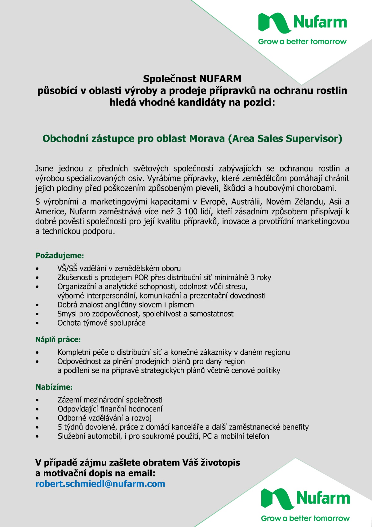Společnost Nufarm Limited je jednou z předních světových společností zabývajících se ochranou rostlin a výrobou specializovaných osiv. Vyrábíme přípravky, které zemědělcům pomáhají chránit jejich plodiny před poškozením způsobeným pleveli, škůdci a houbovými chorobami. S výrobními a marketingovými kapacitami v Evropě, Austrálii, Novém Zélandu, Asii a Americe, Nufarm zaměstnává více než 3 100 lidí, kteří zásadním způsobem přispívají k dobré pověsti společnosti pro její kvalitu přípravků, inovace a prvotřídní marketingovou a technickou podporu.