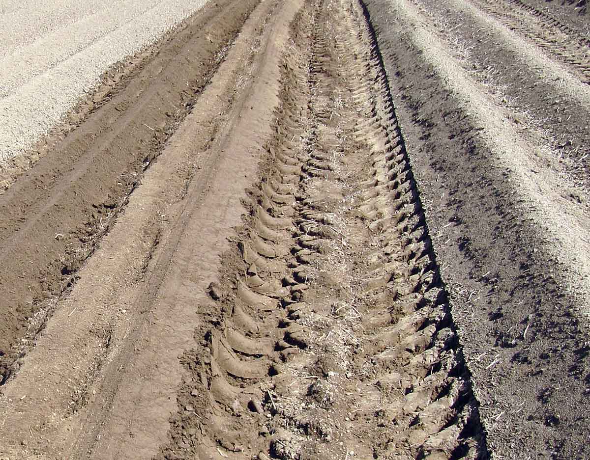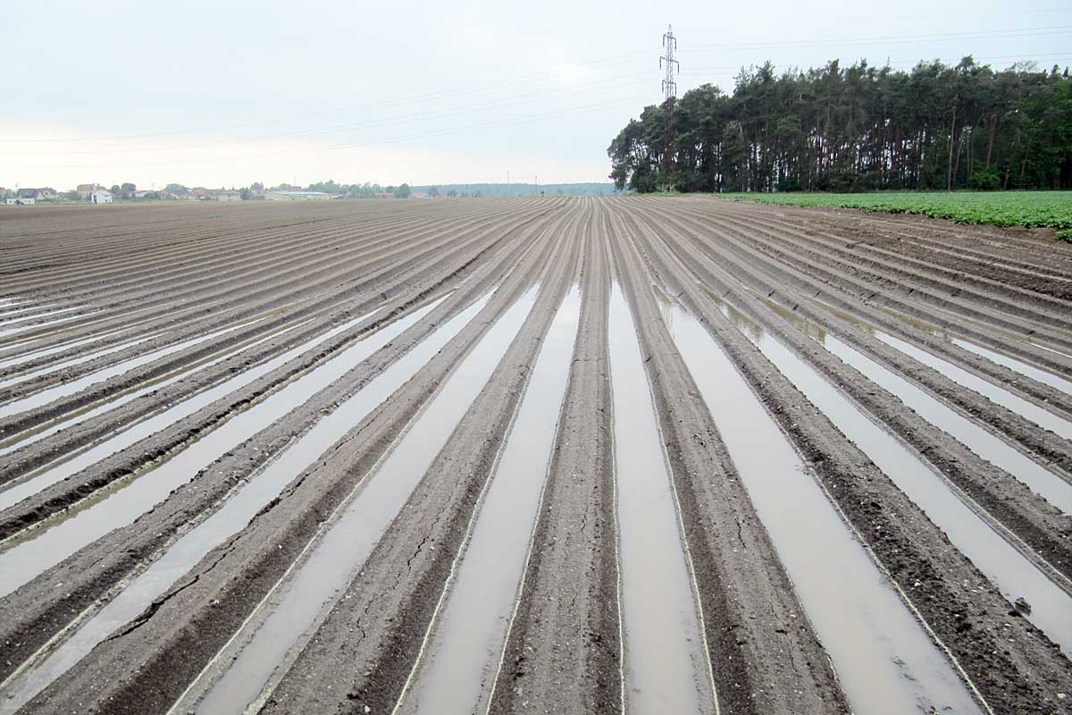 Tvar hrůbků a jejich povrch vytvářený při sázení brambor má významný vliv na zadržení vody ze srážek nebo závlahy a její infiltraci do hrůbku. Na obrázku 1 je zobrazen nevhodný tvar hrůbků vytvořený lisovacími plechy s hladkou horní částí a bočními stěnami, ze kterých voda při srážkách nebo závlaze rychle stéká do brázdy. V té pak odtéká do níže položených míst (obr. 2) a v případě větší svažitosti a intenzivnějších srážek může docházet k vodní erozi. Při doporučovaném sázení brambor na svažitých pozemcích po vrstevnici často dochází zejména při vlhčí půdě ke sjíždění kol traktoru i sazeče po svahu (obr. 3) a v důsledku toho rozšiřování brázd, deformaci boku hrůbků a utužení půdy v místech, kde má voda infiltrovat z brázdy do hrůbku (obr. 4). To má nepříznivý vliv nejen na následné hromadění vody v brázdách, ale i napojení postřiků pesticidů bez nedostřiků nebo přestřiků při přejezdu aplikační techniky v širších a posunutých brázdách. Při protržení hrůbků po intenzivních srážkách pak může docházet k větším škodám způsobených vodní erozí než při sázení po spádnici (obr. 5).