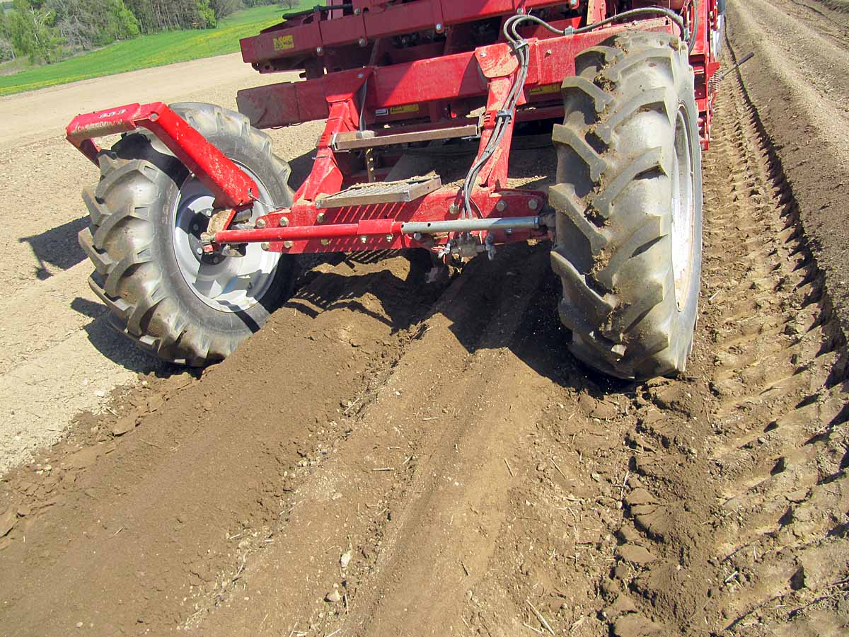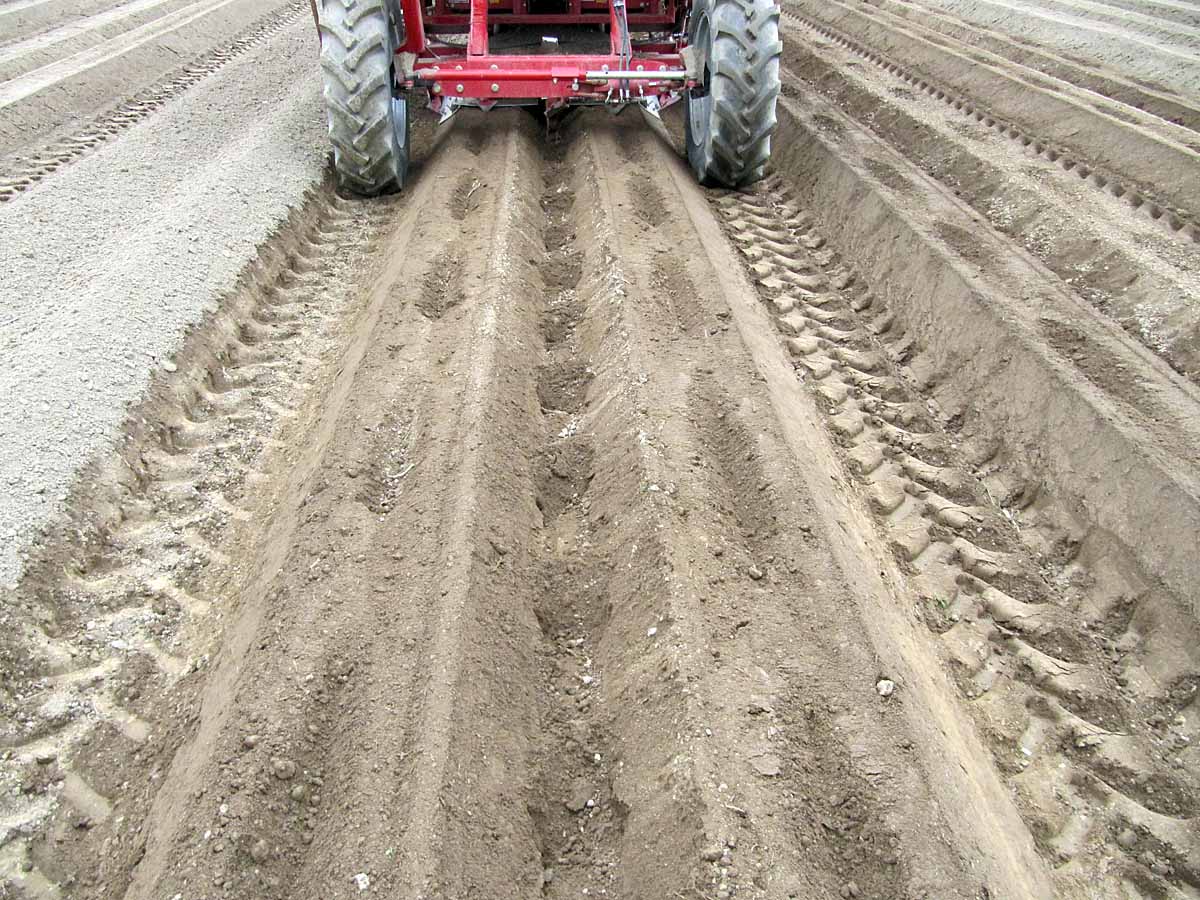Obr. 6: Vytváření přerušovaných žlábků na povrchu hrůbku a důlků v nekolejové brázdě při sázení brambor