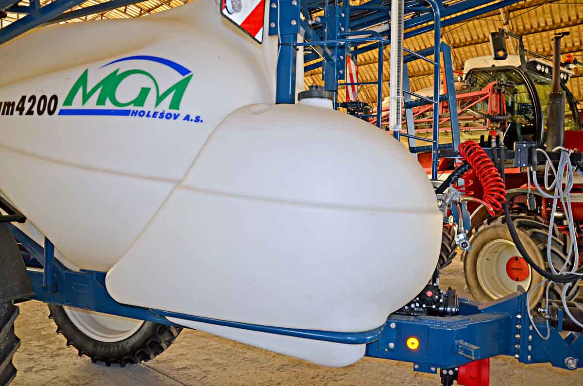Proplachovací nádrž u návěsného postřikovače ve které je převážena čistá voda pro výplach a oplach postřikovače