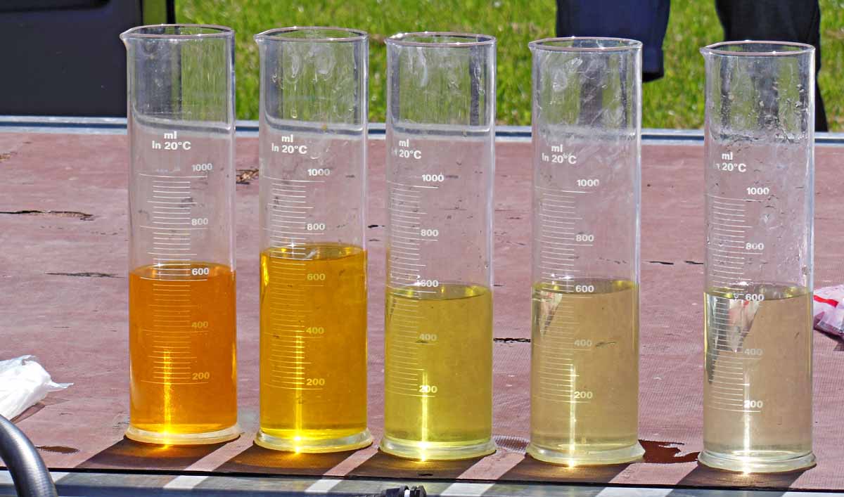 Odměrné válce se vzorky oplachové vody ukazujívcí její postupné rozřeďování v nádrži postřikovače