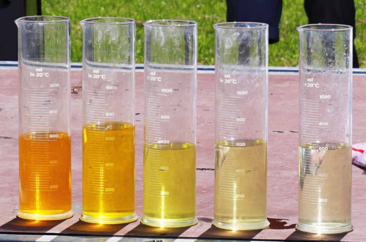 Odměrné válce se vzorky oplachové vody, předvádějící její postupné rozřeďování v nádrži postřikovače