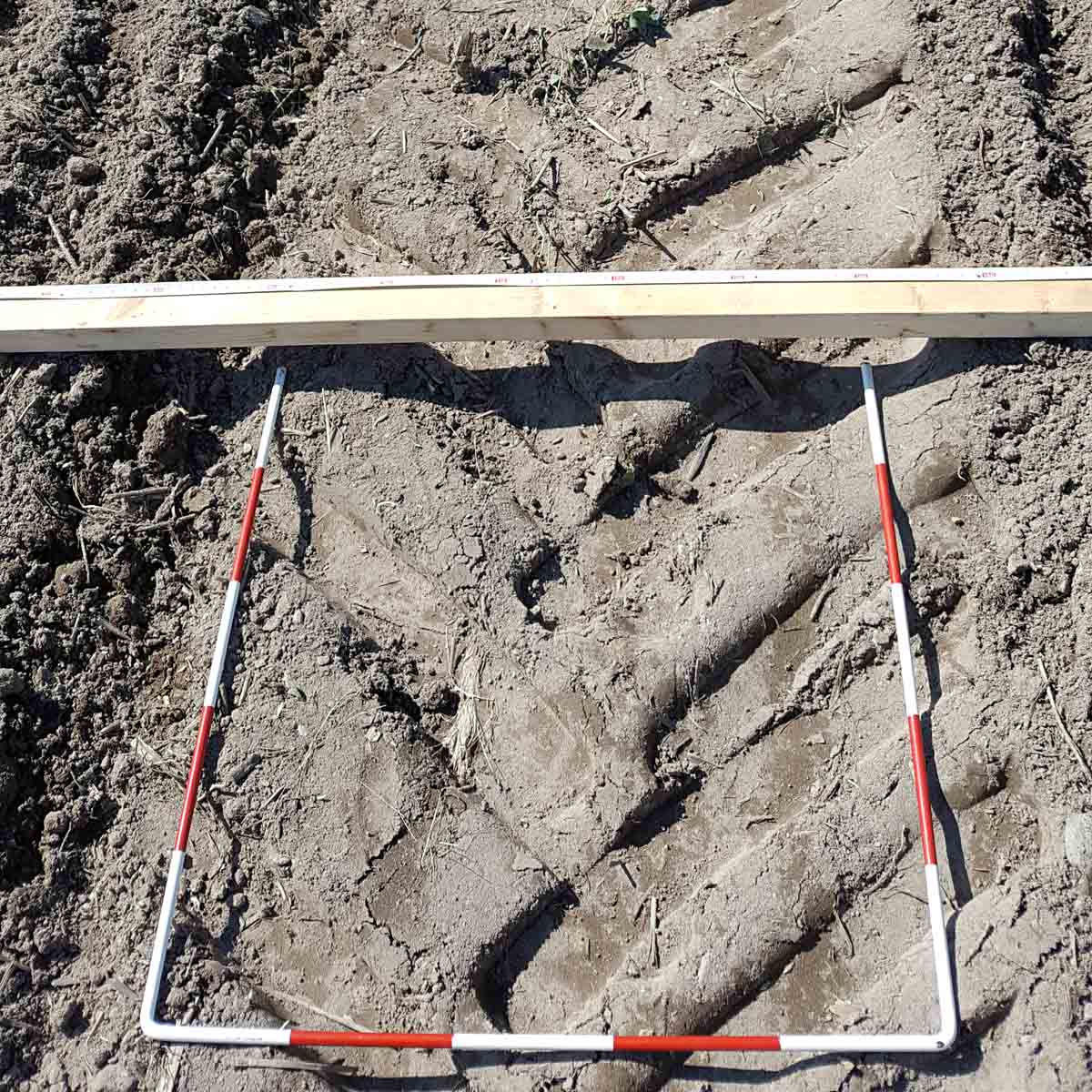Profil pojezdové stopy (otisku) gumových pásů a kolových pneumatik tahačů byl měřen pomocí odměrné tyče vybavené nivelačním měřidlem, vyznačující rovinu. Měřena byla hodnota hloubky otisku v půdě. Při měření byly pořízeny fotografie (obr. 1), které znázorňují stopy od pojezdových ústrojí vlevo od kolového traktoru a vpravo od pásového tahače.