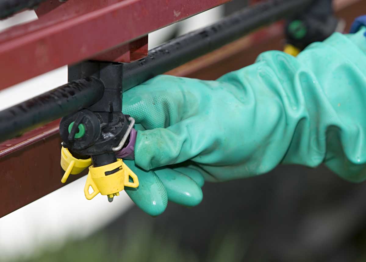 Manipulace s tryskami na postřikovači vždy v ochranných rukavicích (TOPPS)