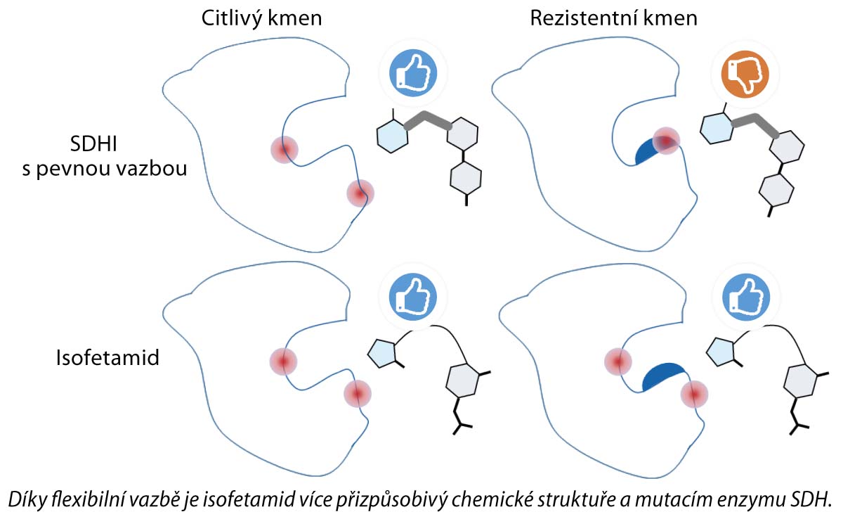 Isofetamid je nová účinná látka z nové chemické skupiny phenyl-oxo-ethyl thiophene amide. Mechanizmem účinku jí můžeme zařadit mezi inhibitory enzymu sukcinát dehydrogenázy (SDHI). Na rozdíl od většiny ostatních účinných látek patřících do této skupiny má odlišnou chemickou strukturu (vazbu) spojující dvě části molekuly isofetamidu. Této vazbě říkáme flexibilní nebo volná. Její zásluhou se isofetamid dokáže lépe přizpůsobit a navázat na patogeny i rezistentní vůči ostatním látkám ze skupiny SDHI.