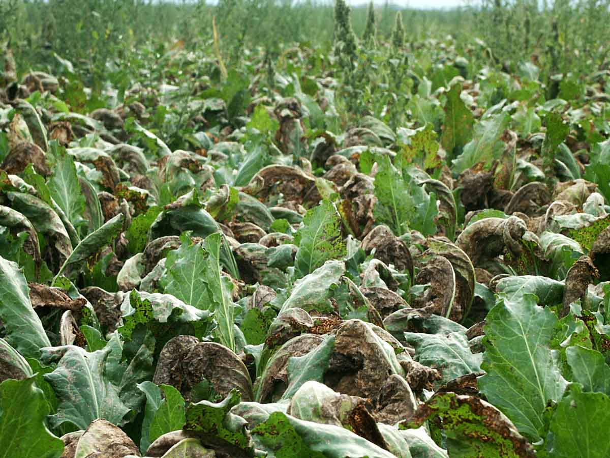 Obr. 2: Silná nekrotizace listů při silném tlaku Cercospora beticola