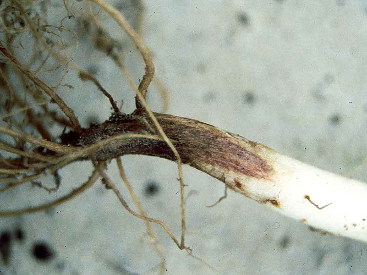 První příznaky můžeme pozorovat na naklíčené sadbě, kde se tvoří hnědé nekrotické skvrny na napadených klíčcích, při silnější infekci klíčky odumírají. Rostliny z infikované sadby špatně vzchází a mají obvykle menší počet stonků. V průběhu vegetace se tvoří nekrózy také na stolonech a na podzemní části stonků. Může dojít k popraskání stonků, které jsou pak sekundárně napadány bakteriemi. Dále dochází k narušení toku asimilátů ve vodivých pletivech, což se projeví na nadzemní části rostlin žloutnutím a podélným svinováním vrcholových lístků. Rostliny rychleji stárnou a odumírají.
