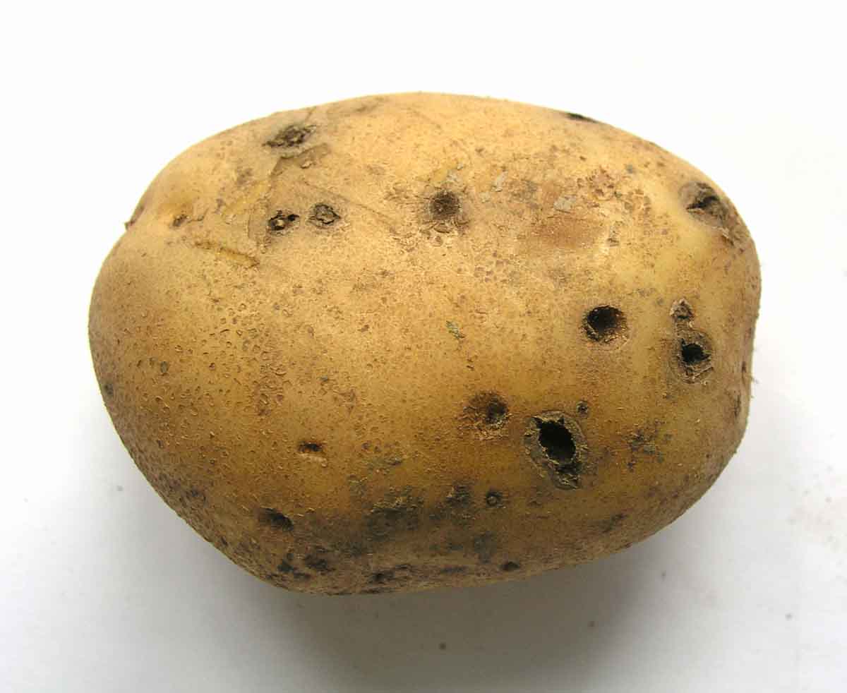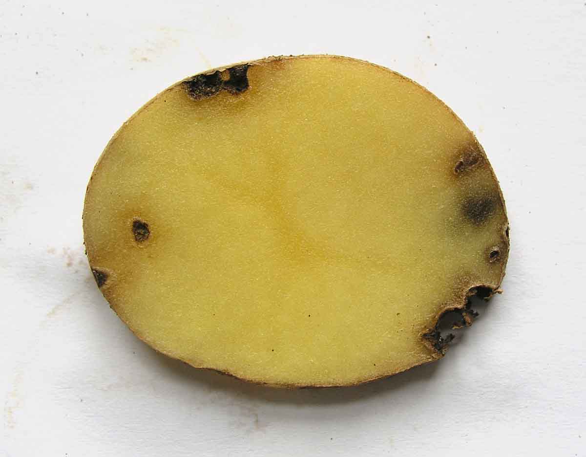 Hlízy se tvoří blízko povrchu půdy, jsou drobné, nevyrovnané, často nazelenalé s netypicky zkorkovatělou slupkou. Ke konci vegetace se na hlízách tvoří sklerocia v podobě hnědočerných skvrnek či povlaků. Při silné infekci můžeme na hlíze pozorovat píštělovou hnilobu - hnědé dutinky v místě lenticel.