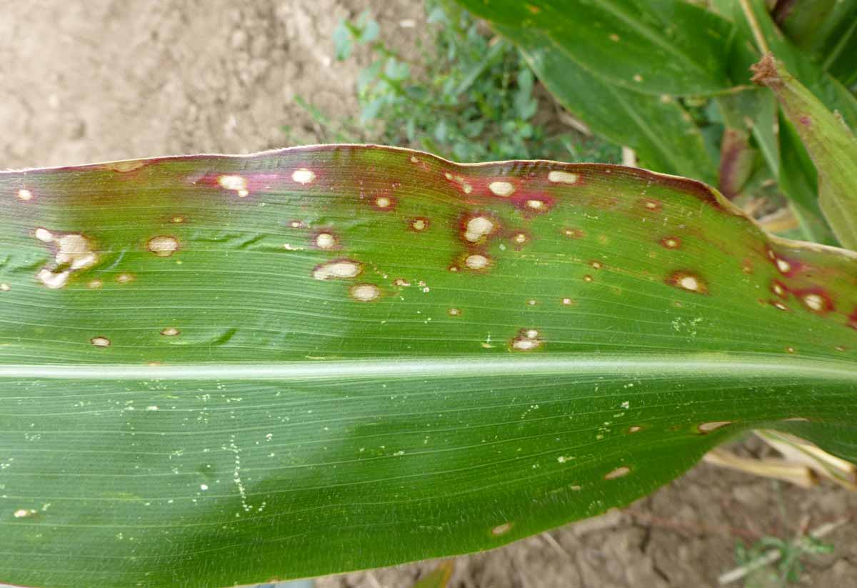 Chladné a vlhké počasí prospívá patogenu Kabatiella zeae způsobující listovou skvrnitost „eyespot“. Houba vytváří drobné světlé až průsvitné skvrny s červenohnědým okrajem a chlorotickým lemem (hallo). Skvrny jsou okrouhlé až oválné o průměru 0,1–0,4 cm, uspořádané podél listové žilky. Postupně středy skvrn zasychají. Kabatiella zeae přežívá myceliem na rostlinných posklizňových zbytcích. Na jaře se tvoří konidie, které se odstřikujícími kapkami deště nebo větrem šíří na mladé rostliny. Konidie se tvoří v acervulích (ložiska spor), jsou jednobuněčné, elipsoidní, mírně zakřivené, velikosti 2,5–5,0 x 12–22 um.