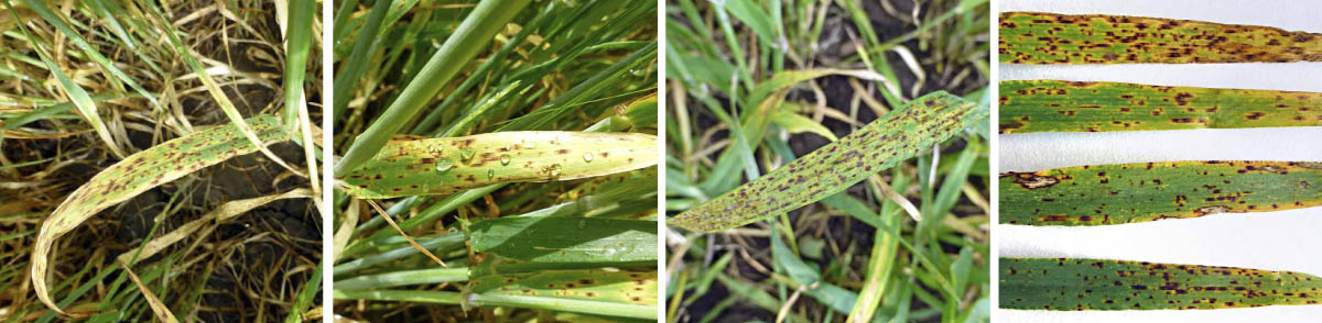 Obr. 1–4: Tmavohnědá skvrnitost ječmene - symptomy na listech