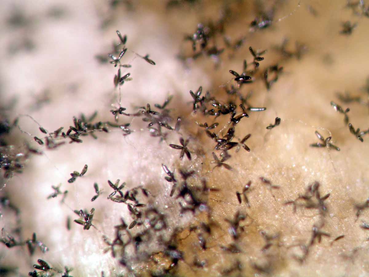 Na nekrotických skvrnách se tvoří konidie. Tvorbu spor podporují vydatné srážky a nižší teploty (15–20 °C). Konidie jsou dvoubuněčné, bezbarvé, mírně zahnuté, 16–20 × 3–5 µm velké. Patogen přežívá myceliem na infikovaných posklizňových zbytcích a na výdrolu.