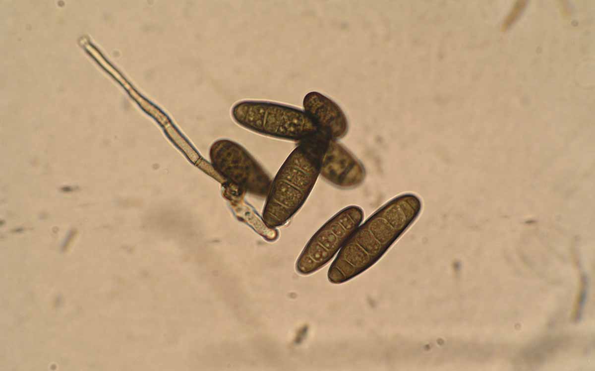 Patogen je přenosný osivem. Nepříznivé podmínky přežívá myceliem na infikovaných posklizňových zbytcích a v osivu. Během vegetace se šíří konidiemi. Konidiofory se vyskytují jednotlivě nebo v malých skupinkách. Konidie mají vřetenovitý tvar, jsou olivově hnědé a 60–120 × 15–20 µm velké se třemi až deseti přehrádkami.