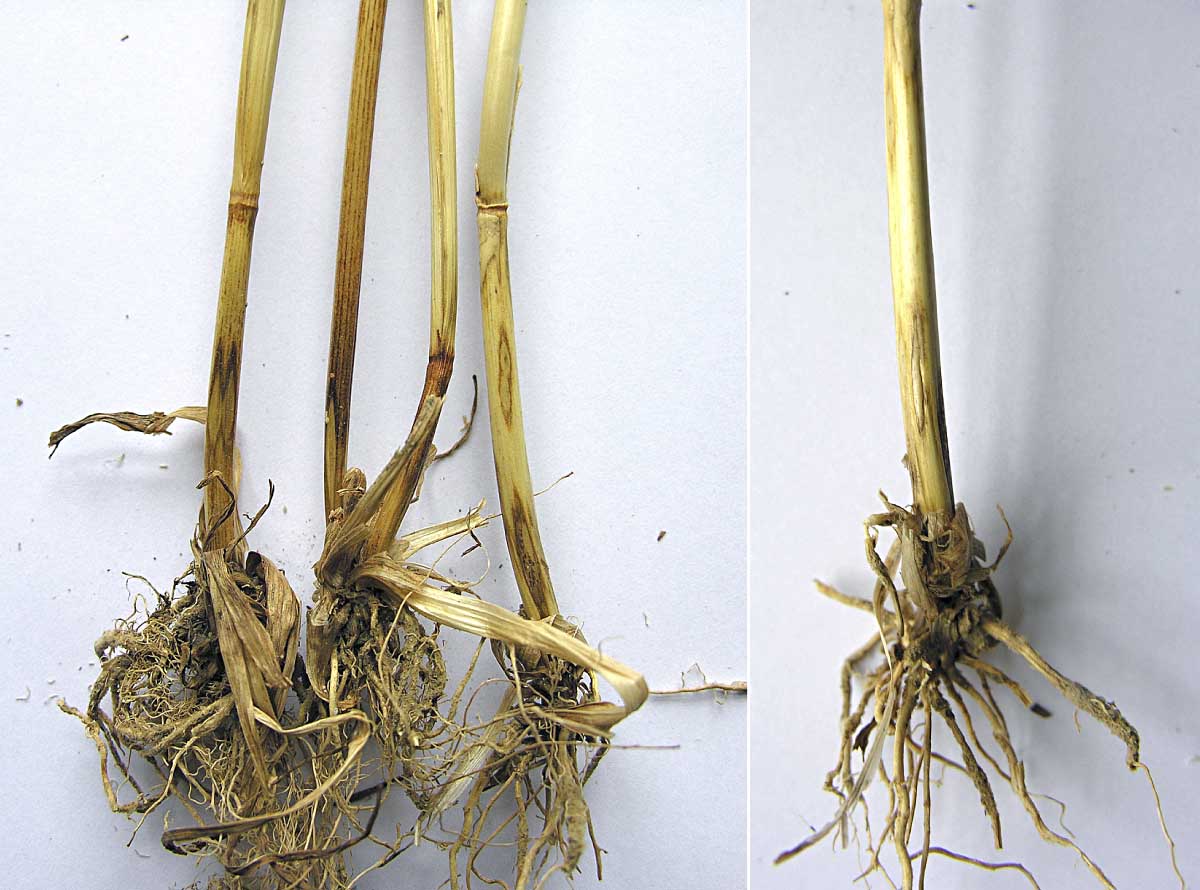 Obecnou krčkovou a kořenovou hnilobu pšenice, žita, ječmene a kořenovou hnilobu ovsa způsobují patogeny Cochliobolus sativus a Fusarium spp.