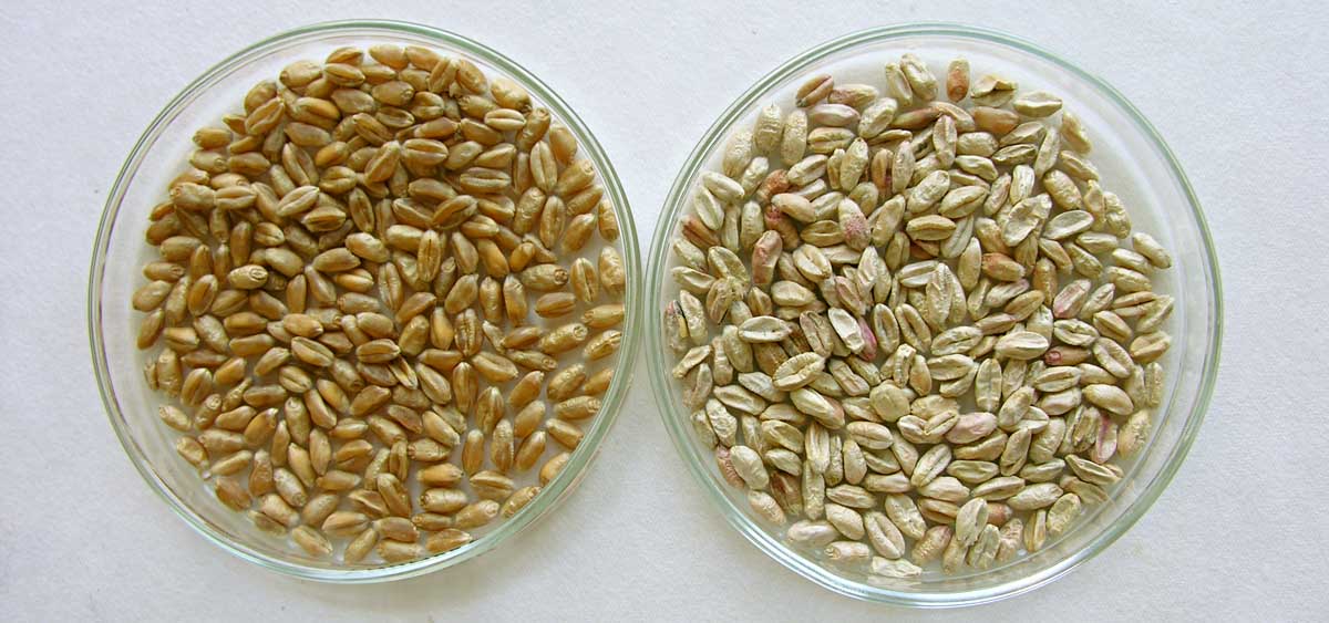 obr. 6 Zdravé (vlevo) a napadené (vpravo) zrno
