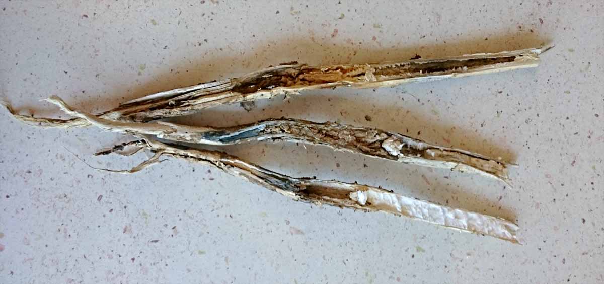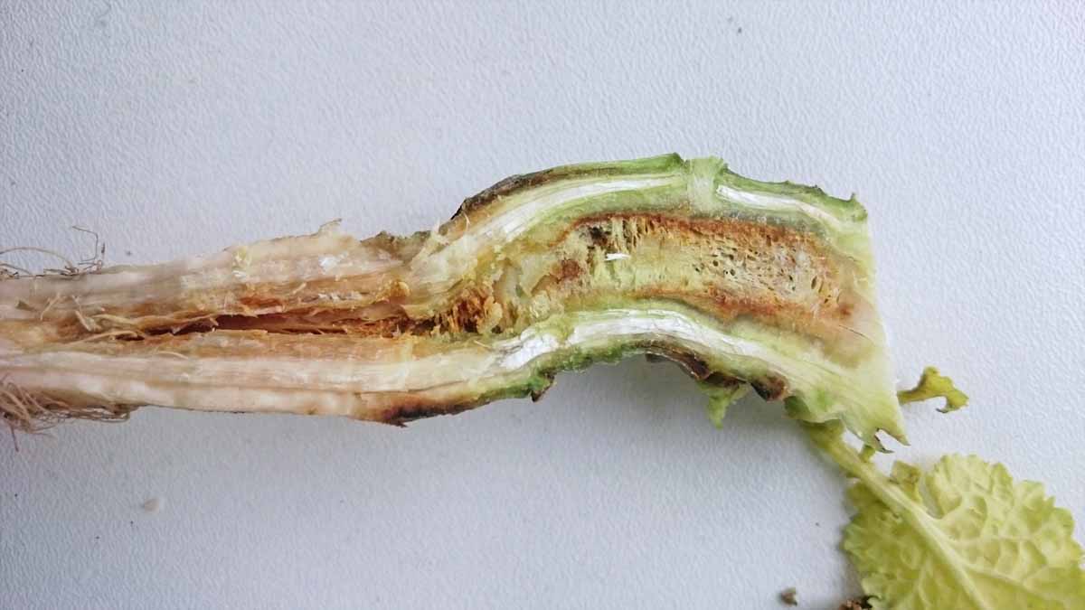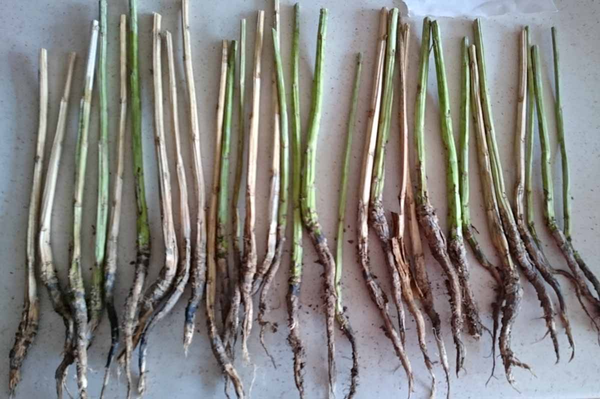 Výrazne poškodené spodné časti stoniek a korene rastlín repky so symptómami chorôb, hlavne verticíliového vädnutia, na konci vegetačnej doby 2. júla