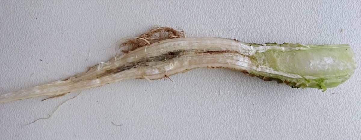Na priereze koreňov bolo možné pozorovať nasledovné symptómy: A - svetlá, bledožltá prasklina na koreňovom kŕčku (pravdepodobne následkom intenzívneho rastu); B - hnedá prasklina a hnednutie okolitých pletív koreňa; C - sivo sfarbené cievne zväzky a pletivo v okolí cievnych zväzkov lokalizované v strednej alebo v spodnej časti koreňa; D - prasklina v hornej časti koreňa a na koreňovom kŕčku; E - hnednutie a hniloba koreňového kŕčka.