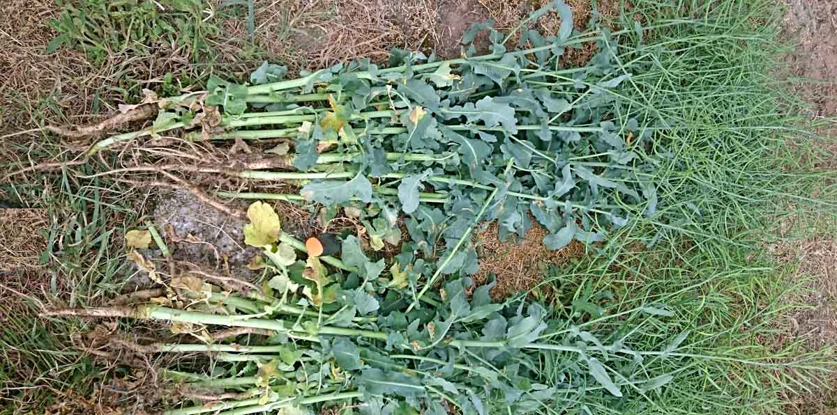 Zničené koreňové kŕčky a korene repky na konci vegetačnej doby 2. júla