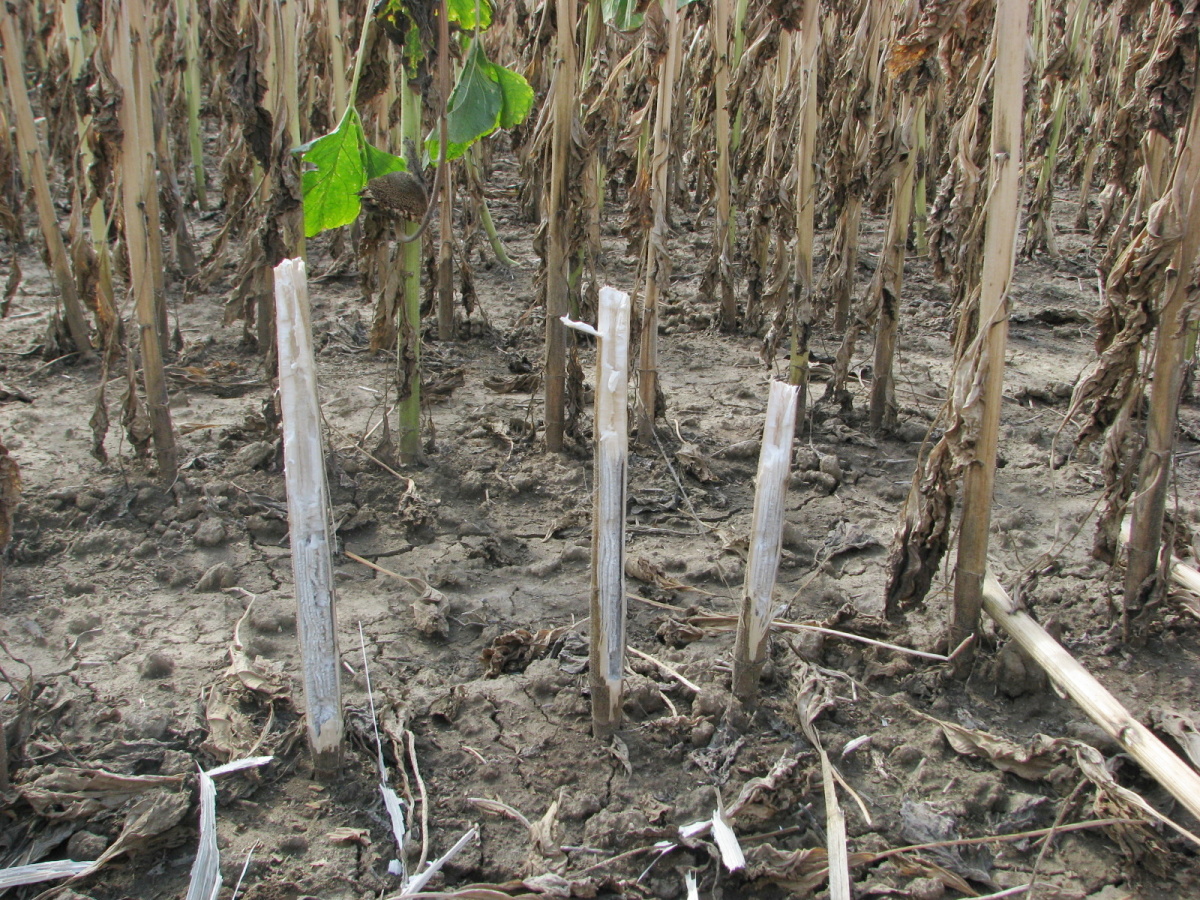 Rastliny slnečnice so symptómami popolavej hniloby, ktorá patrila k najrozšírenejším a najškodlivejším chorobám slnečnice v roku 2015