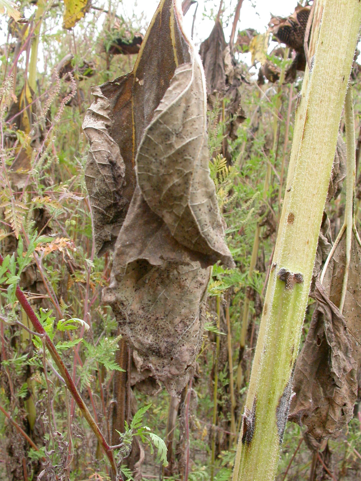 Kvôli suchu a slabým zrážkam v júni i v júli bol výskyt symptómov sivej škvrnitosti slnečnice, ktorú spôsobuje huba Diaporthe helianthi zaznamenaný v porastoch slnečnice len na 4 lokalitách v oblasti juhovýchodného a na 3 lokalitách v oblasti juhozápadného Slovenska. Len na jednej lokalite na východnom Slovensku bol zistený vyšší počet napadnutých rastlín (8 %), na ostatných siedmich lokalitách bolo napadnutých menej ako 1 % rastlín. Podobne nízky počet rastlín so symptómami sivej škvrnitosti slnečnice bol pozorovaný aj v roku 2013.