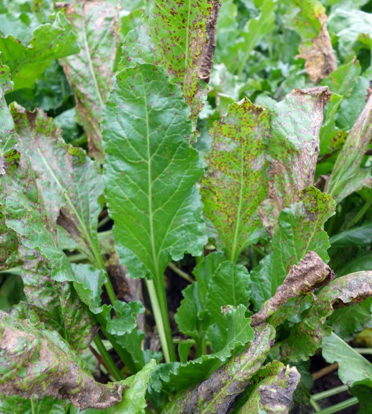 Rozhodující vliv na devastaci listového aparátu měla Cercospora beticola způsobující cerkosporovou listovou skvrnitost, která patří mezi nejvýznamnější listové choroby cukrovky (obr. 2a, b).
