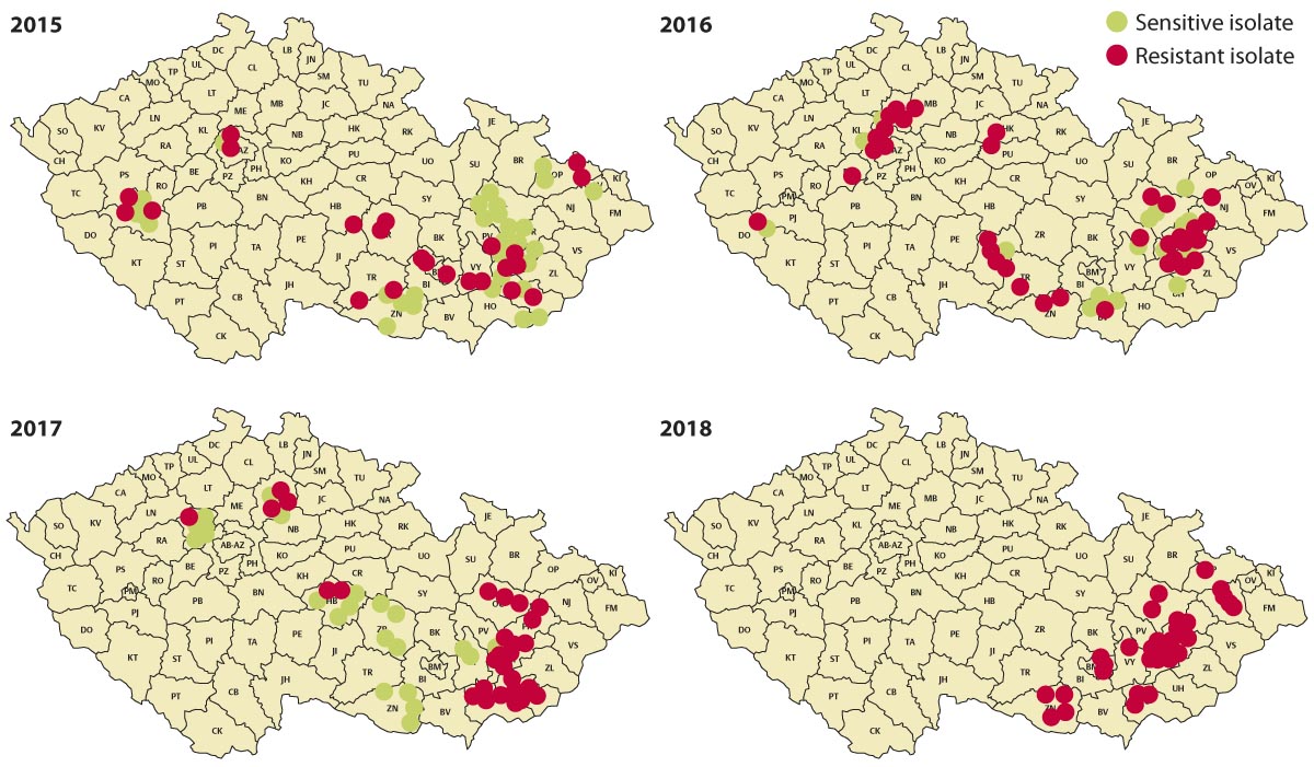 Během posledních pěti let došlo k výraznému navýšení rezistentních izolátů Zymoseptoria tritici v populaci. Zatímco v roce 2015 byla zhruba polovina analyzovaných jedinců rezistentní vůči strobilurinům, v roce 2018 již byla populace ze sta procent plně rezistentní (graf 1, mapa 1).