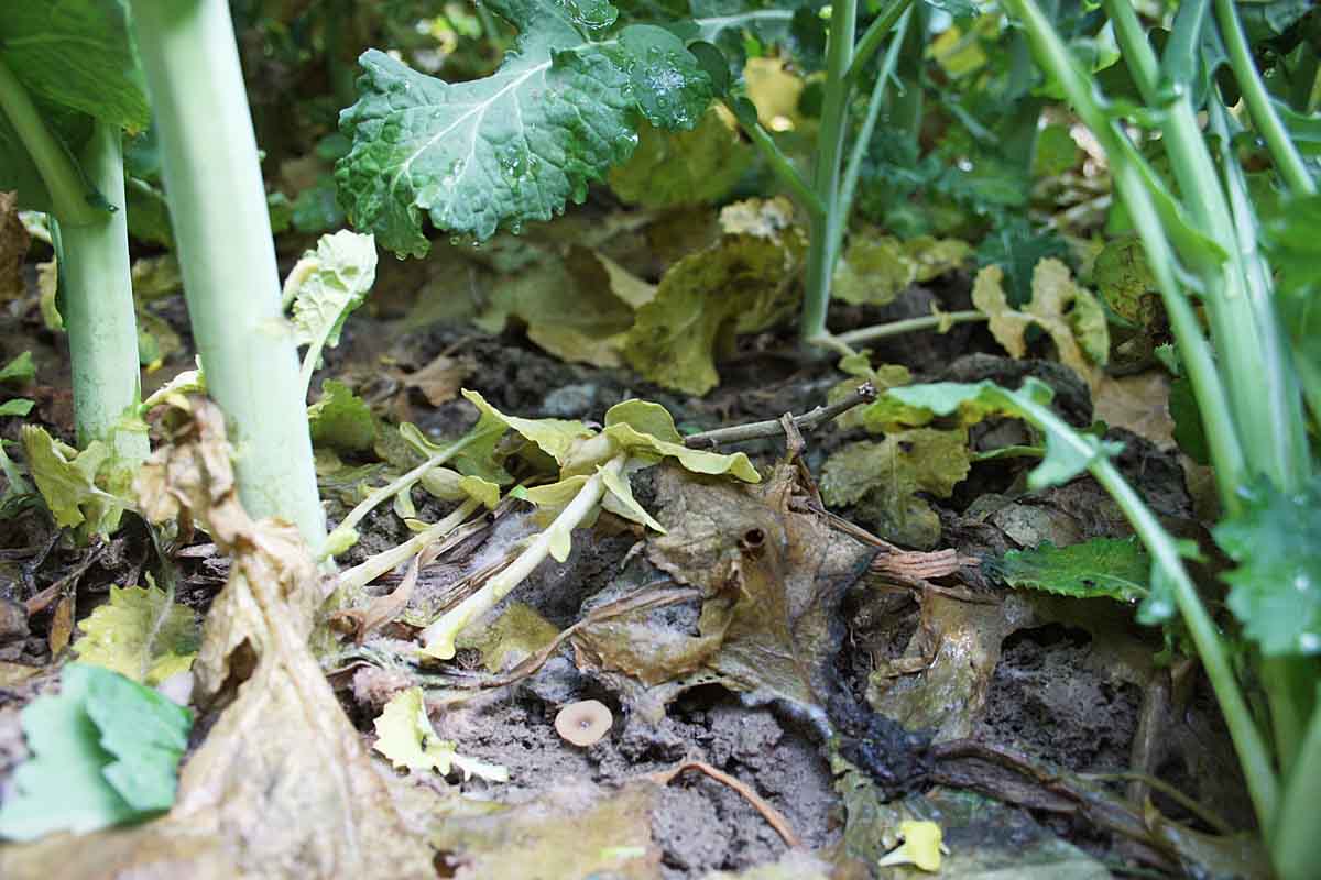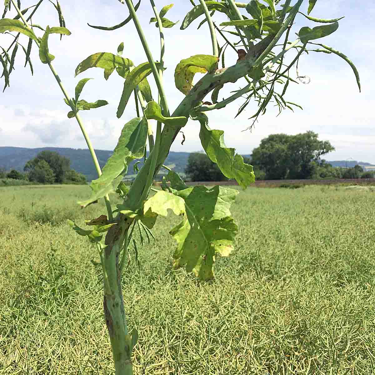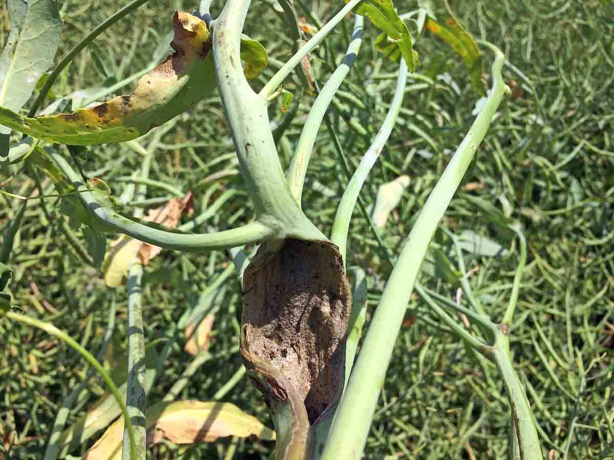 Obr. 4: Stonek řepky se vlivem žíru krytonosců a následným napadením houbovými chorobami se postupně devastuje