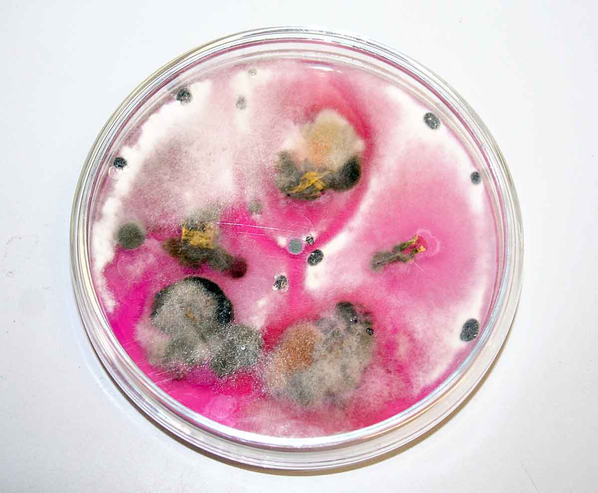Obr. 2: Sklerocia jsou útvary hrudkovitého či ledvinovitého charakteru v bílém myceliu při petal testech při růstu na agarovém médiu