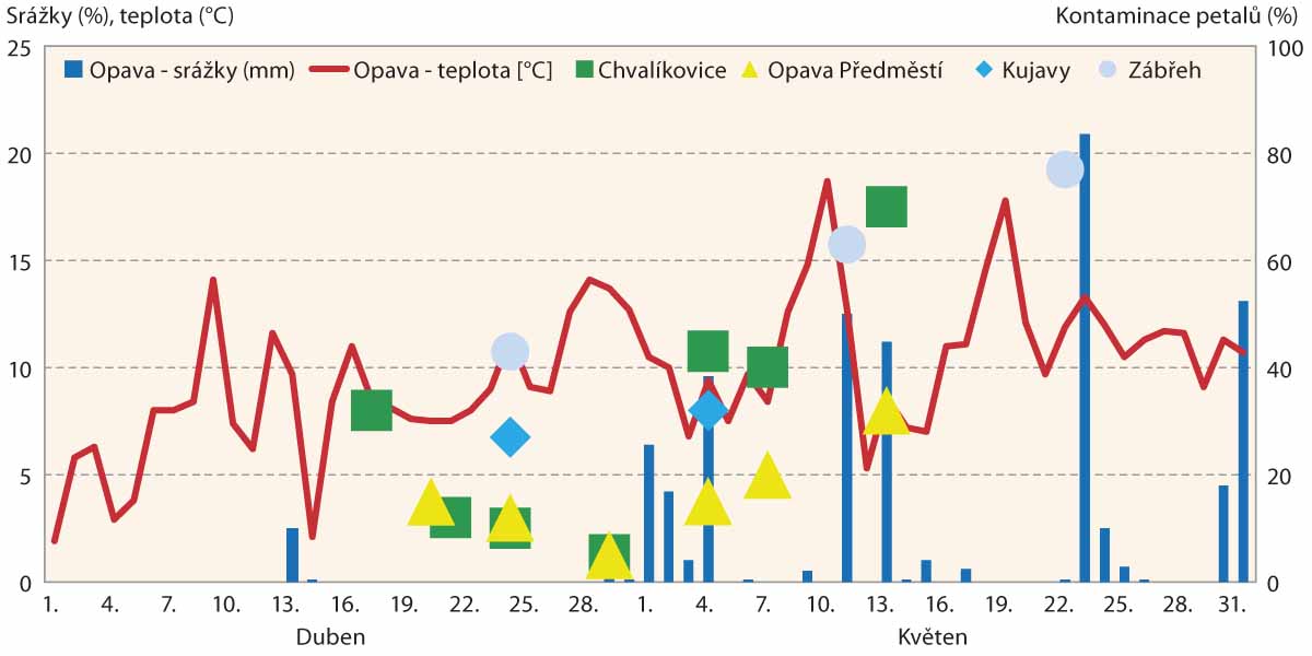 Graf 1: Průběh denních teplot a srážek (Opava) a kontaminace petalů: Chvalíkovice, Opava Předměstí, Kujavy, Zábřeh (ŠU), 1. 4.–31. 5. 2020