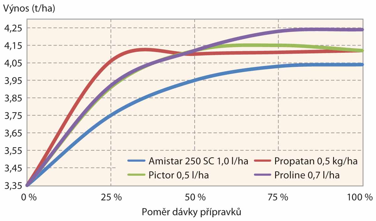 Výsledky jsou zobrazeny v grafu 2, kde je patrný výrazný pokles napadení již po aplikaci poloviční registrované dávky přípravků. Mimo hodnocení napadení stonků bílou hnilobou řepky bylo provedeno výnosové hodnocení, které je v grafu 3 (průměry jsou přepočteny na 9% vlhkost). Z křivek ukazující nárůst výnosů po aplikaci fungicidů lze též vyvodit nárůst zisku oproti kontrole, který u nejziskovějšího fungicidního ošetření činí 8 277 Kč/ha (při ceně řepky 9 300 Kč/t sklizně).