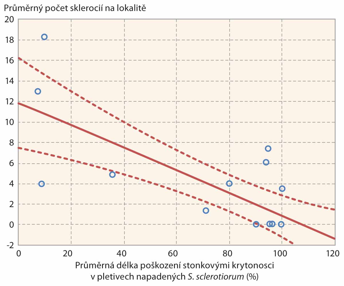 Pro nahlédnutí pod pokličku takto položené otázce byl vytvořen pokus s hodnocením a sběrem vzorků sklerocií na celkem 21 lokalitách Šumperska (12.–14. 7. 2017 a 2.–6. 7. 2018) ve vývojových fázích porostu mezi BBCH 79–81. Na každé lokalitě bylo náhodně uřezáno 50 rostlin napadených bílou hnilobou, které byly sesbírány pochůzkou porostem řepky úhlopříčně na daný tvar pole. U jednotlivých rostlin bylo hodnoceno procento napadení bílou hnilobou řepky z napadených stonků chorobou, průměrný počet sklerocií v jednotlivých napadených stoncích a průměrnou hmotností sklerocií na lokalitu. Další hodnocení se opírala o procento poškození stonků žírem larev krytonosců v pletivech stonků poškozených bílou hnilobou. V jednotlivých stoncích byly změřeny prožrané „dráhy“ larev stonkových krytonosců v místech s myceliem postiženým bílou hnilobou (délka požerku i délka napadení myceliem byly zaznamenány v cm a nezajímalo nás prožrání larvami mimo místa nepostižených myceliem). Tyto údaje byly za jednotlivé lokality zprůměrovány a dány do korelace s průměrem počtu a váhou odebraných sklerocií z rostlin za lokalitu. Korelační analýzy a jejich grafické znázornění byly vypočteny v programu Statistica 12.