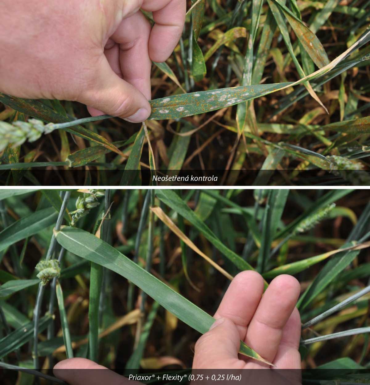 Skvělé výsledky potvrzují i pokusy z roku 2019 založené na mnoha lokalitách po celé ČR. Alespoň jako ilustrační ukázku přikládáme fotografie odrůdového pokusu ze ZS Kujavy (obr. 1). Na kontrolních neošetřených variantách byl koncem června 2019 silný tlak rzi pšeničné i padlí travního. Naopak varianta, která byla ošetřena kombinací Priaxor® + Flexity® v dávce 0,75 l/ha + 0,25 l/ha, následováno klasovým specialistou Osiris® v dávce 1,5 l/ha, byla pšenice ve skvělé kondici.