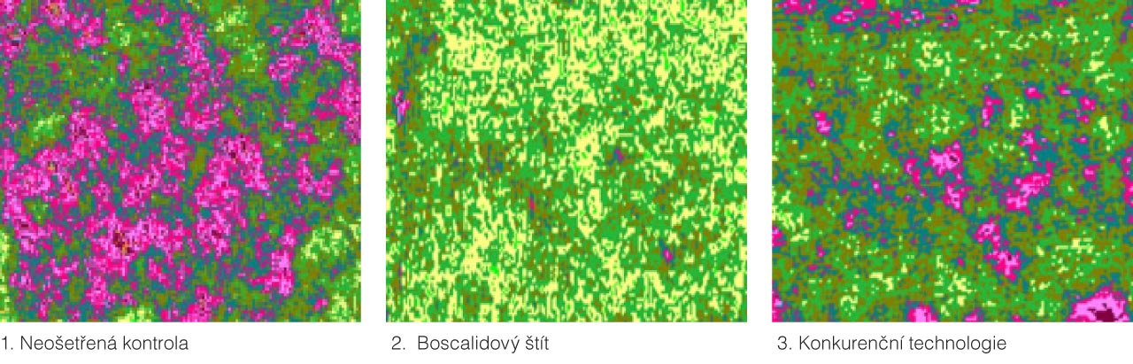 Obr. 1: Infračervené fotografie s porovnáním účinnosti technologie boscalidového štítu, konkurenční technologie a neošetřené kontroly, ZS Kluky 2016.