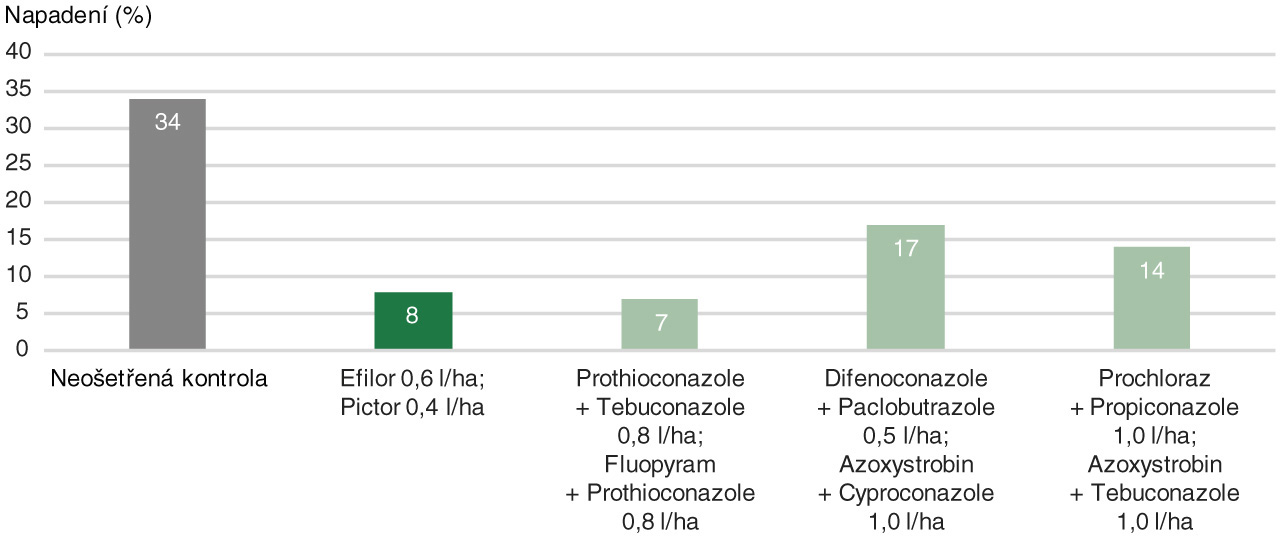 Graf 1: Účinnost fungicidu Efilor® v systému boscalidového ochranného štítu na fomovou hnilobu, n=2, ZS Kujavy a Opava 2016