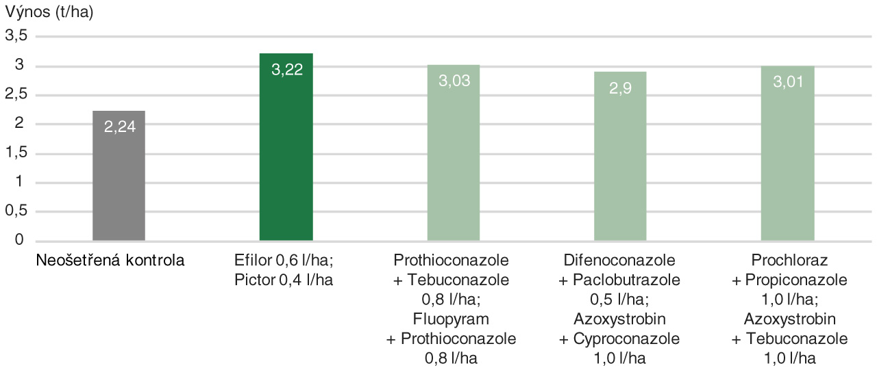 Náš tip* Aplikujte Efilor® v dávce 0,6 l/ha v časném jaru (výška řepky 15–40 cm) jako ochranu proti fomové hnilobě (graf 1), hlízence obecné (graf 2), černi řepkové a plísni šedé. Nejdéle do 21 dnů aplikujte z důvodu kontinuální ochrany porostů řepky proti fomové hnilobě, hlízence obecné (obr. 1) a černi řepkové fungicidní přípravek Pictor® v dávce 0,4 l/ha. Nejlepším termínem pro aplikaci je období květu (BBCH 61–65). Oba přípravky mají AgCelence® efekt, který přináší pozitivní fyziologický vliv na tvorbu bočních větví, nasazení šešulí a u rostlin vykazuje lepší toleranci ke stresovým podmínkám. Výsledkem jsou vyšší výnosy, zlepšení kvality a vyšší produkční výkonnost. |