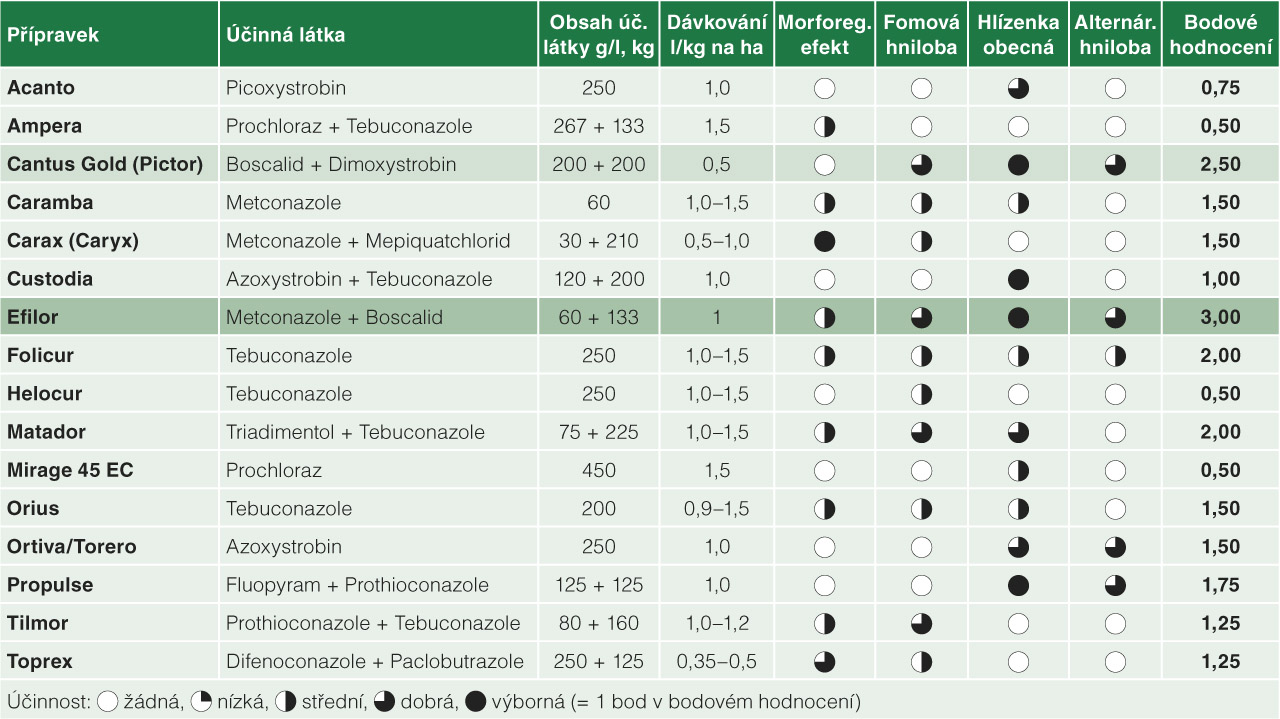 Společnost BASF nabízí od roku 2015 dvousložkový fungicidní přípravek Efilor® s mírným regulačním účinkem. Obsahem přípravku jsou účinné látky metconazole a boscalid. Obě látky mají preventivní i kurativní účinek díky čemuž mohou chránit rostlinu před napadením i po infekci. Účinná látka boscalid patří do inovativní skupiny tzv. karboxamidů (SDHI) s originálním způsobem účinku na dýchací procesy citlivých organismů.