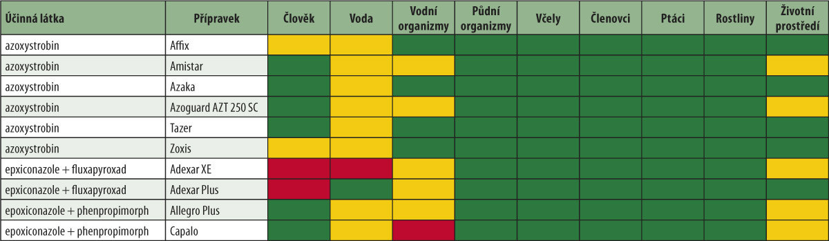 Pro potřeby registračního řízení a následného uvedení na trh jsou testovány finální přípravky. Právě vliv dalších látek obsažených v přípravku je důvodem toho, proč několik přípravků, které obsahují stejnou účinnou látku, je řazeno do různých kategorií z hlediska vlivu na necílové organizmy a složky životního prostředí. Jako příklad mohou posloužit některé fungicidy s ú. l. azoxystrobin (viz tab. 1). Sice konkrétně v případě fungicidů s touto účinnou látkou mi není jasné jejich zařazení do kategorie “zelených“ - s minimálním rizikem nebo „žlutých“ - s přijatelným rizikem pro vodní organizmy vzhledem k tomu, že na etiketách dotčených přípravků se můžeme dočíst, že: „H věty - H410 - Vysoce toxický pro vodní organizmy, s dlouhodobými účinky.“ Nicméně pro zařazení do příslušných kategorií měli kompetentní pracovníci jistě svůj důvod. Možná změna účinnosti a vlivu na necílové organizmy a životní prostředí se samozřejmě týká i kombinací účinných látek, což už je v povědomí pěstitelů zakotveno více. V tabulce 1 jsou uvedeny některé příklady přípravků s obsahem epoxiconazole.