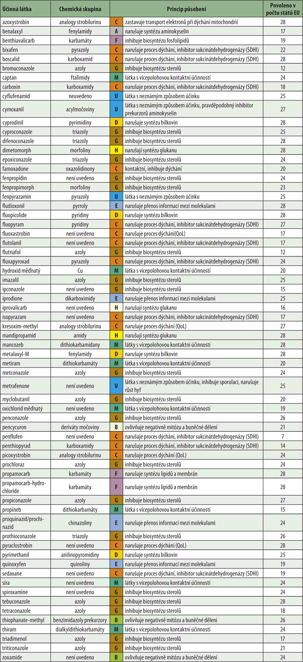V tabulce 3 je uveden seznam u nás povolených fungicidních účinných látek a jejich princip působení. Pro srovnání je uveden také počet států, ve kterých je příslušná účinná látka povolena. Z tohoto údaje je zřejmé, že přes veškeré nářky (do určité míry oprávněné) nad omezováním dostupných přípravků na tom v případě fungicidů nejsme zase tak zle. Poznámka: Názvy účinných látek jsou uvedeny v mezinárodně používané formě, nikoli v české verzi. Osobně se domnívám, že snaha za každou cenu je „počeštit“ vede jen k nepřesnostem a nedorozuměním a zvláště v době, kdy je čeština zahlcena často nesmyslnými amerikanismy je takové úsilí opravdu zbytečné.