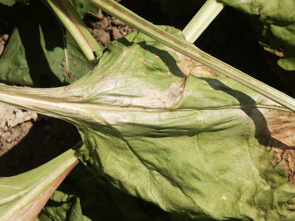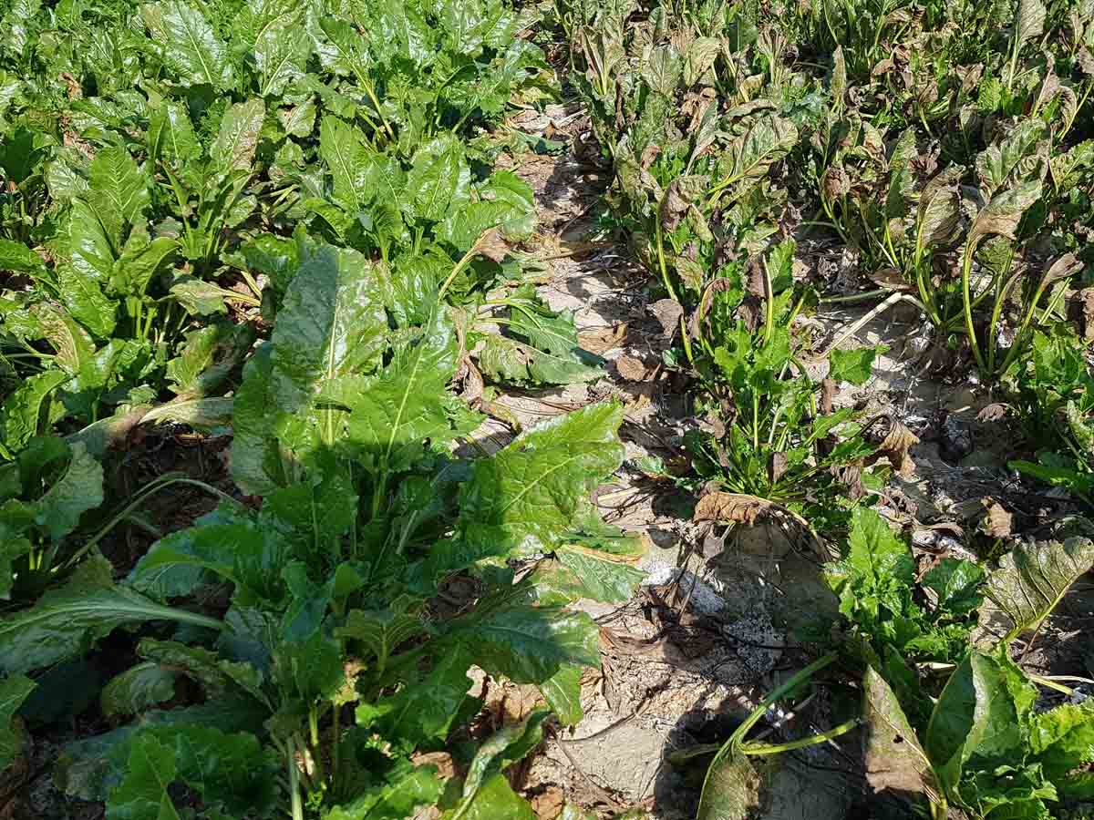 Vysoké teploty a nedostatek vláhy spolu s poškozenými kořeny predisponovaly listy cukrovky k poškození slunečním úžehem se vznikem plošných nekróz na listech v důsledku silného UV záření (obr. 1). I když v srpnu přišly silné vegetační srážky, mnohde cukrovka neobnovila dostatečně listovou plochu a nedošlo k nárůstu kořenů a cukernatosti. Tento růstový stres byl na mnoha místech prohlouben i nevyrovnanou výživou, která souvisí s pH půdy (vliv na přístupnost živin), zásobeností a přístupností dusíku pro obnovu listového aparátu. Samozřejmě velký vliv má též vyrovnaná výživa draslíkem, fosforem a bórem.