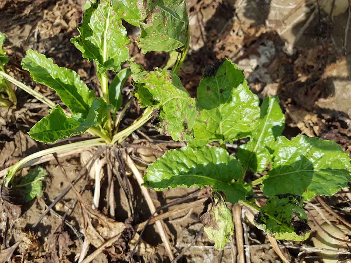 První příznaky na listech byly v roce 2019 zjištěny extrémně brzy již v polovině června na Opavsku (obr. 3). Při velmi silném napadení a silném odumírání listů došlo k silné retrovegetaci (obr. 4) - obnovení růstu mladých listů, což mělo za následek výraznou ztrátu cukernatosti. Hlavním zdrojem napadení je infikovaný řepný chrást, kde houba ve formě stromat může v půdě přežívat i více než dva roky. Vlivem úzkého osevního sledu u cukrovky - řepa po 3–4 letech a vlivem suchých a teplých zim došlo zřejmě k nedostatečnému rozkladu posklizňových zbytků a tedy k silné koncentraci inokula v půdě a to způsobilo nebývalou epidemii patogena v roce 2019.