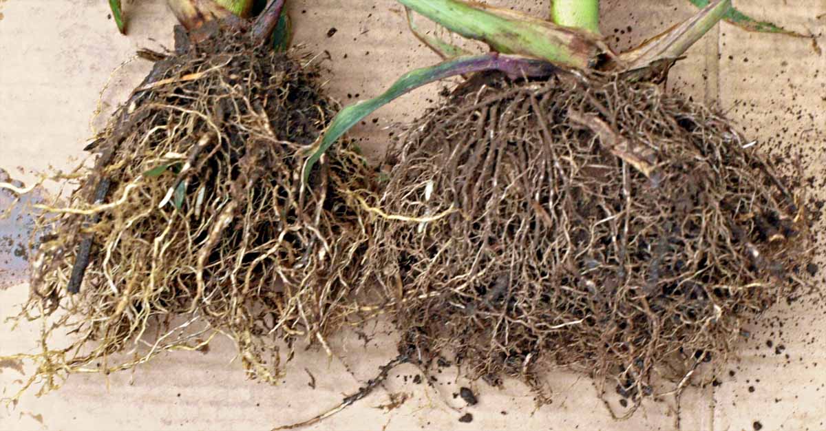 Obr. 2: Vliv houby rodu Trichoderma na větvení a hustotu kořenové soustavy kukuřice (vlevo kontrola)