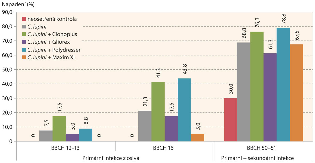 Výsledky pokusu ukazují, že pouze chemický přípravek významně potlačil primární infekci. Biologické přípravky použité v tomto pokusu sice potlačují výskyt především půdních fytopatogenních hub, např. Rhizoctonia solani nebo Sclerotinia sclerotiorum, což ukazují jiné výzkumné studie, nicméně regulovat tohoto agresivního osivem přenosného patogena lupiny nestačily do té míry, aby se zabránilo primární infekci v době vzcházení (graf 1). Všeobecnou charakteristikou biologických přípravků na bázi mykoparazitických hub je, že na rozdíl od chemických přípravků potřebují více času k tomu, aby se v půdním prostření nejdříve aklimatizovaly, namnožily a poté účinně redukovaly patogeny.