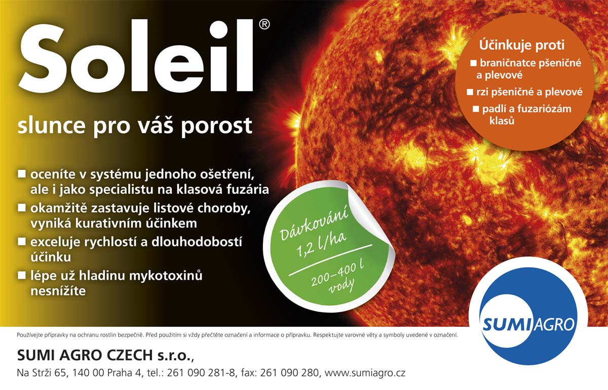 Už samotný výčet škodlivých činitelů napoví, že se jedná o širokospektrální fungicid. Kromě cílené aplikace na klasové choroby lze Soleil využít i v takzvané ekonomické variantě ošetření - tedy při jedné aplikaci fungicidu. Pro obě varianty ošetření si stačí zapamatovat jednotnou aplikační dávku 1,2 l/ha. Na zkušenosti s přípravkem Soleil a nejen s ním jsem se vydal zeptat na severovýchod Čech.