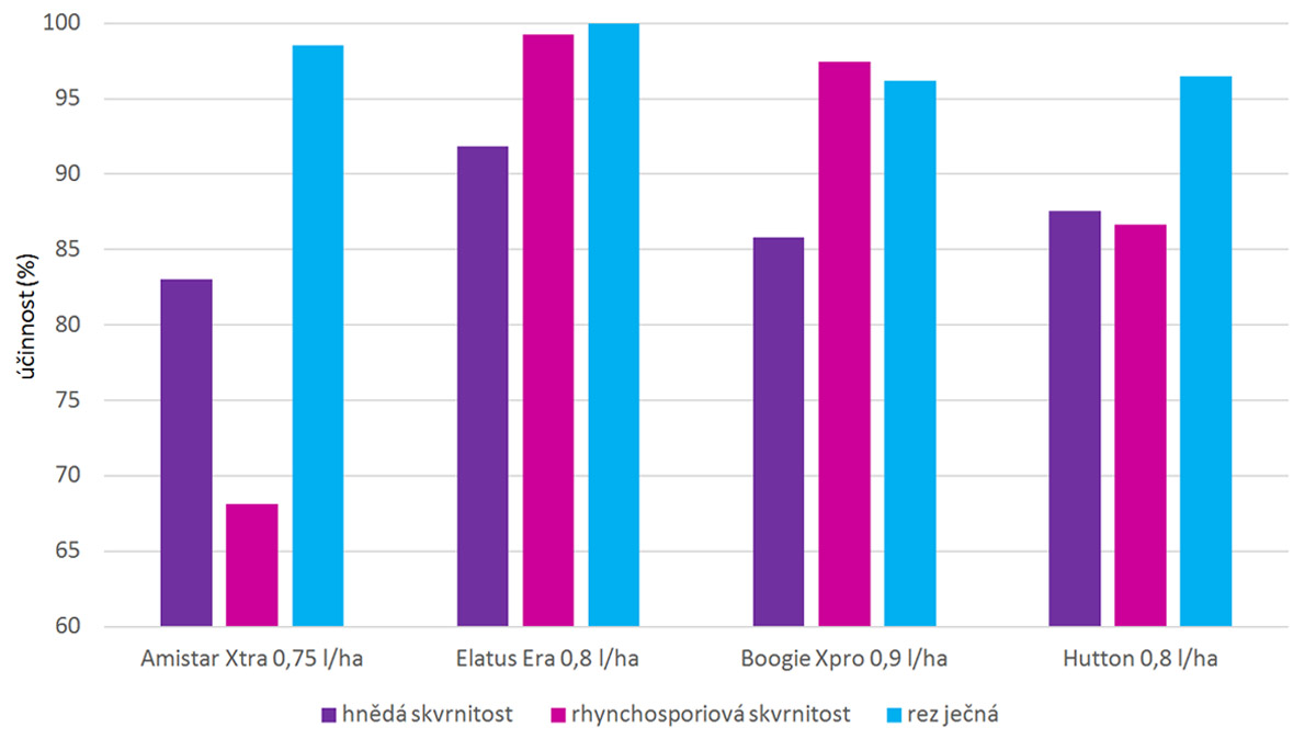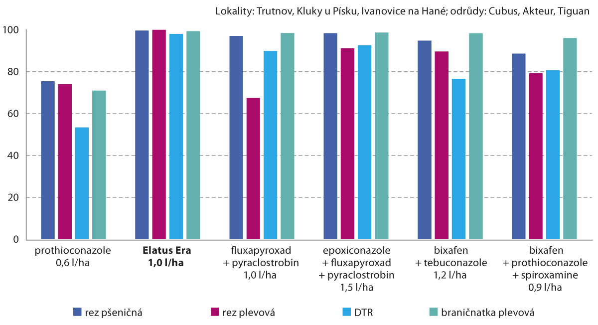 V pokusech napříč Českou republikou i v zahraničí se jasně ukázalo, že žádný konkurenční přípravek nemá tak kompletní a vysokou účinnost jako Elatus™ Era. V grafu 1 je znázorněna míra účinnosti na čtyři klíčové choroby pšenice - braničnatku pšeničnou, rez pšeničnou a plevovou a DTR a účinnost je u fungicidu Elatus™ Era vždy excelentní. Obdobných výsledků bylo také dosaženo v případě hodnocení účinnosti na potlačení chorob ječmene jarního. I zde byla potvrzena kompletní a vysoká účinnost proti hnědé, rhynchosporiové skvrnitosti a rzi ječné (graf 2). Kompletní přehled účinnosti fungicidu Elatus™ Era je uveden v tabulce 1.